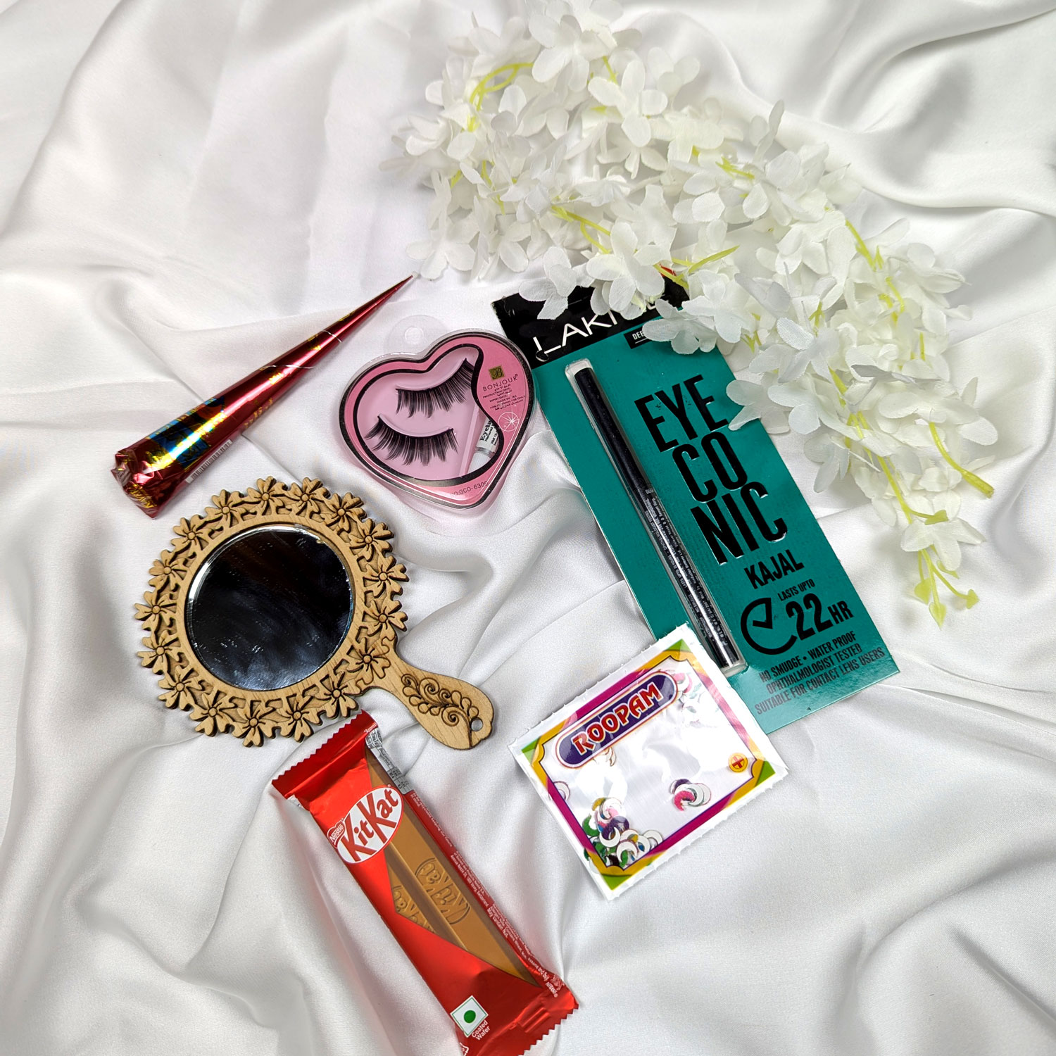 কমপ্লিট বিউটি সেট: নেইল পলিশ, চাঁদ টিপ, কাজল, আইল্যাশ এবং হাত রাঙাতে মেহেদি।