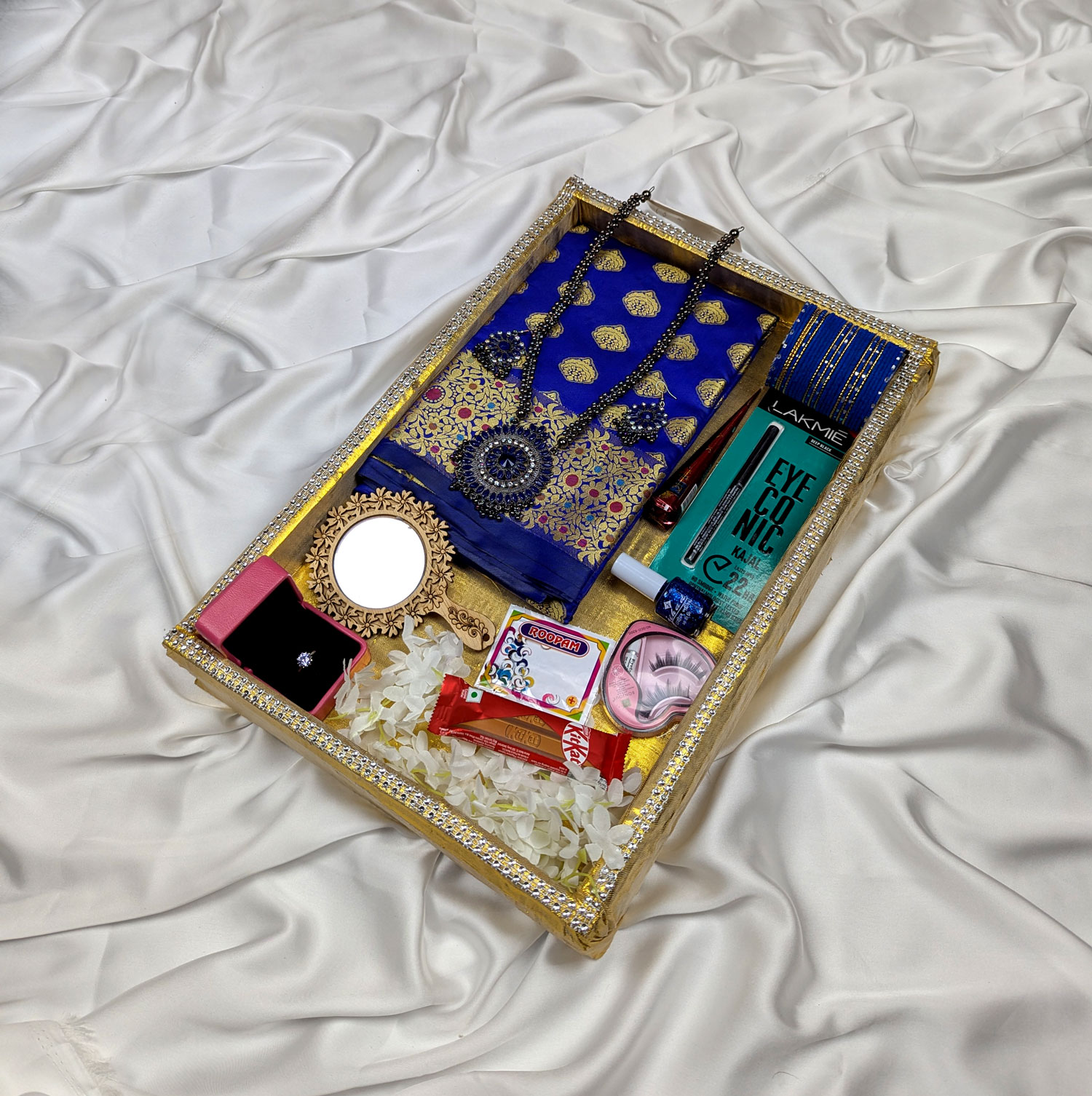 ১. প্রিমিয়াম সিল্ক কাতান শাড়ি (নীল অথবা কালো) ২. ম্যাচিং গলার হার ৩. ম্যাচিং কানের দুল ৪. ম্যাচিং চুড়ি সেট ৫. ফিঙ্গার রিং (উইথ বক্স) ৬. ম্যাচিং নেইল পলিশ ৭. চাঁদ টিপ ৮. উডেন (কাঠের) আয়না ৯. প্রিমিয়াম কাজল ১০. কোণ মেহেদি ১১. সাজের গাজরা ১২. আইল্যাশ ১৩. কিটক্যাট (KitKat) চকোলেট ১৪. আকর্ষণীয় গিফট প্যাকেজিং ১৫. আপনার ভালোবাসার ছোঁয়া!