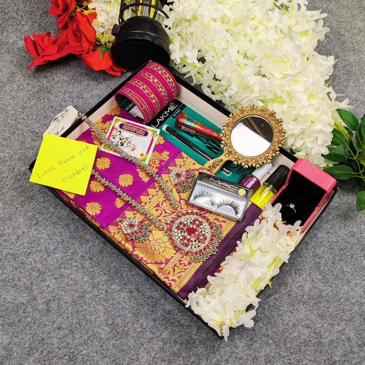 ১. প্রিমিয়াম সিল্ক কাতান শাড়ি (পার্পল) ২. ম্যাচিং গলার হার ৩. ম্যাচিং কানের দুল ৪. ম্যাচিং চুড়ি সেট ৫. ফিঙ্গার রিং (উইথ বক্স) ৬. ম্যাচিং নেইল পলিশ ৭. চাঁদ টিপ ৮. উডেন (কাঠের) আয়না ৯. প্রিমিয়াম কাজল ১০. কোণ মেহেদি ১১. সাজের গাজরা ১২. আইল্যাশ ১৩. এক্সক্লুসিভ পারফিউম ১৪. আকর্ষণীয় গিফট প্যাকেজিং ১৫. আপনার ভালোবাসার স্পর্শ!