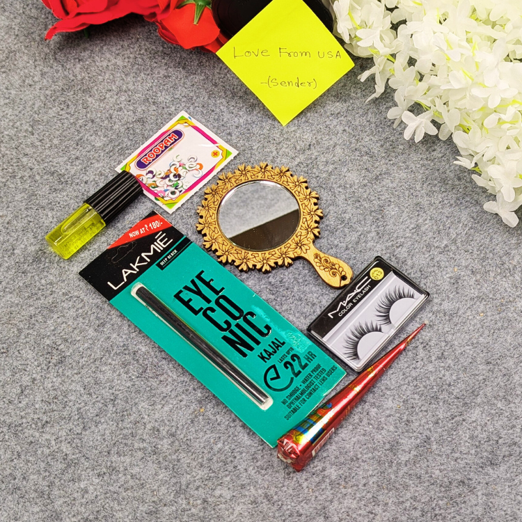 কমপ্লিট বিউটি সেট: ম্যাচিং নেইল পলিশ, চাঁদ টিপ, কাজল, আইল্যাশ, গাজরা এবং হাত রাঙাতে মেহেদি।
